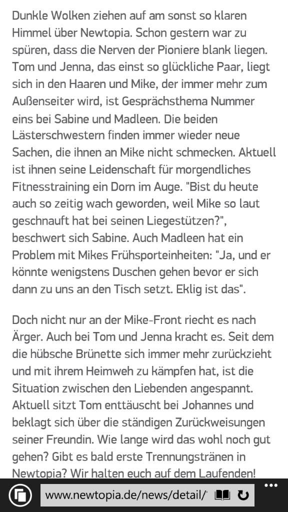 Heute Morgen ging eine News online, deren Inhalt nicht erklärbar war. Sie war nur kurz zu sehen, dennoch gibt es Screenshots. Die Aufregung ist groß. In dieser News wurde die Geschichte von Pionieren erzählt, die sich derzeit gar nicht in Newtopia befinden. Ihre Namen: Tom, Jenna und Mike und noch einige mehr. Eine Liebesgeschichte wird beschrieben und dass dunkle Wolken am Newtopia-Himmel aufgezogen wären.
